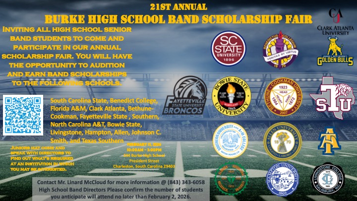 The Burke High School Band program invites all high school senior band students to participate in their annual Scholarship Fair. Students will have the opportunity to audition and compete for band scholarships offered by the colleges and universities listed on the flyer.