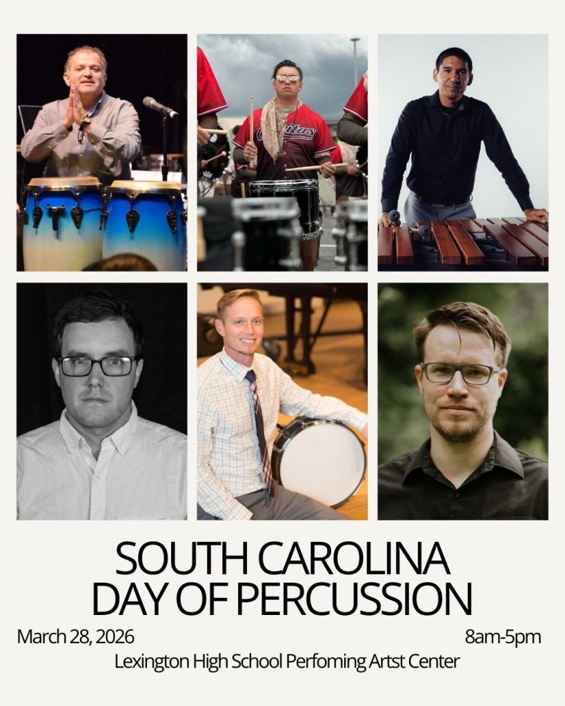 The South Carolina chapter of PAS is proud to present our annual Day of Percussion, a percussion ensemble festival, a snare drum solo contest, a keyboard solo contest, and our intercollegiate percussion ensemble. This year, we have the privilege of welcoming special guests, including Lalo Davila, Civitas Independent Percussion, Dr. Paul Buyer, Dr. Jesse Willis, Dr. Omar Carmenates, Dr. Bailey Seabury, and Dr. Cory High.